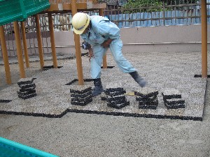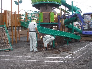 夏休み中、より安全に遊べるようにクッション材を遊具下に敷き詰める工事を