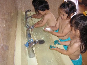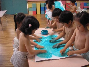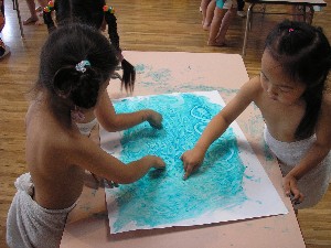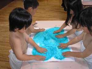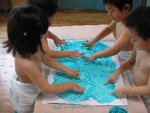 のりを混ぜた絵の具を使い、ぬるぬるした感触を楽しみながら