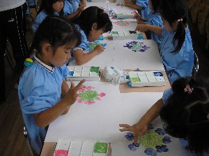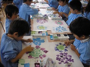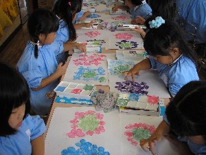 フィンガ-ペイントで “あじさい” の観察画