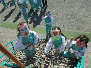 自分が作った鬼のお面をつけ、鬼も豆まきをしました。