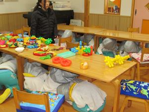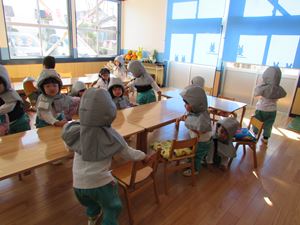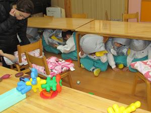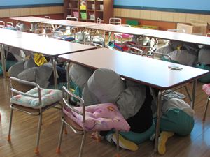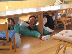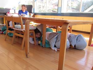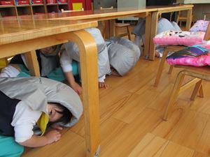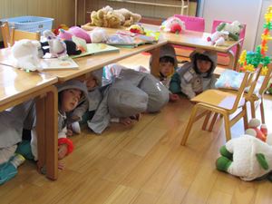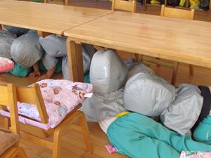 非常ベルが鳴ると、みんな防災ずきんをかぶり、机の下へ