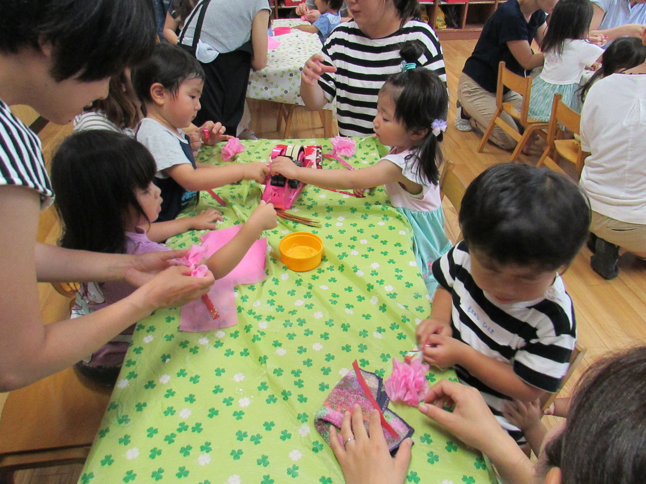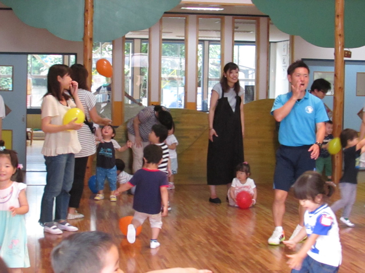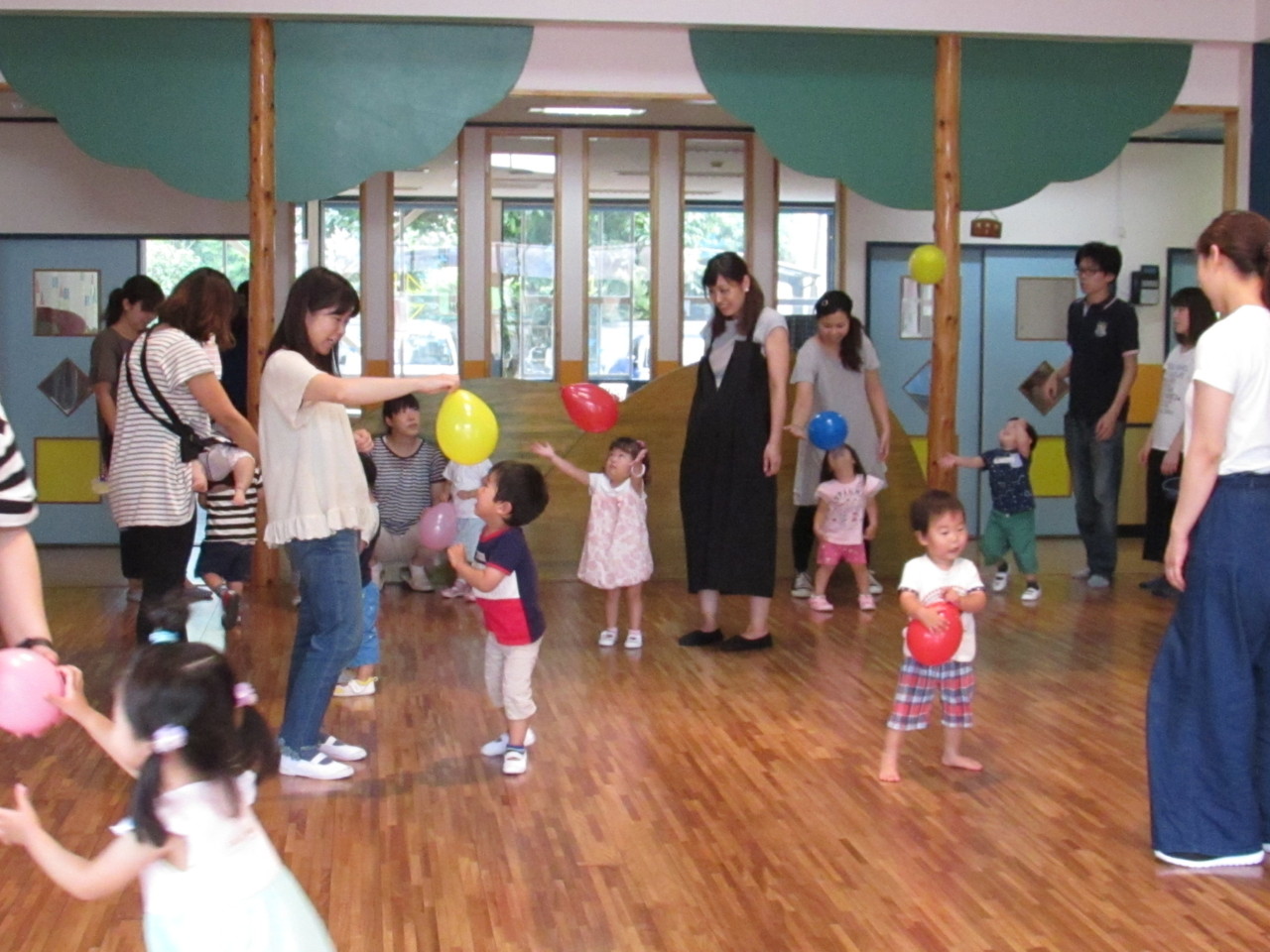 晴れたらプ-ル遊びでしたがあいにくのお天気で残念でした。でもたくさんのお友だちが遊びに来てくれました。