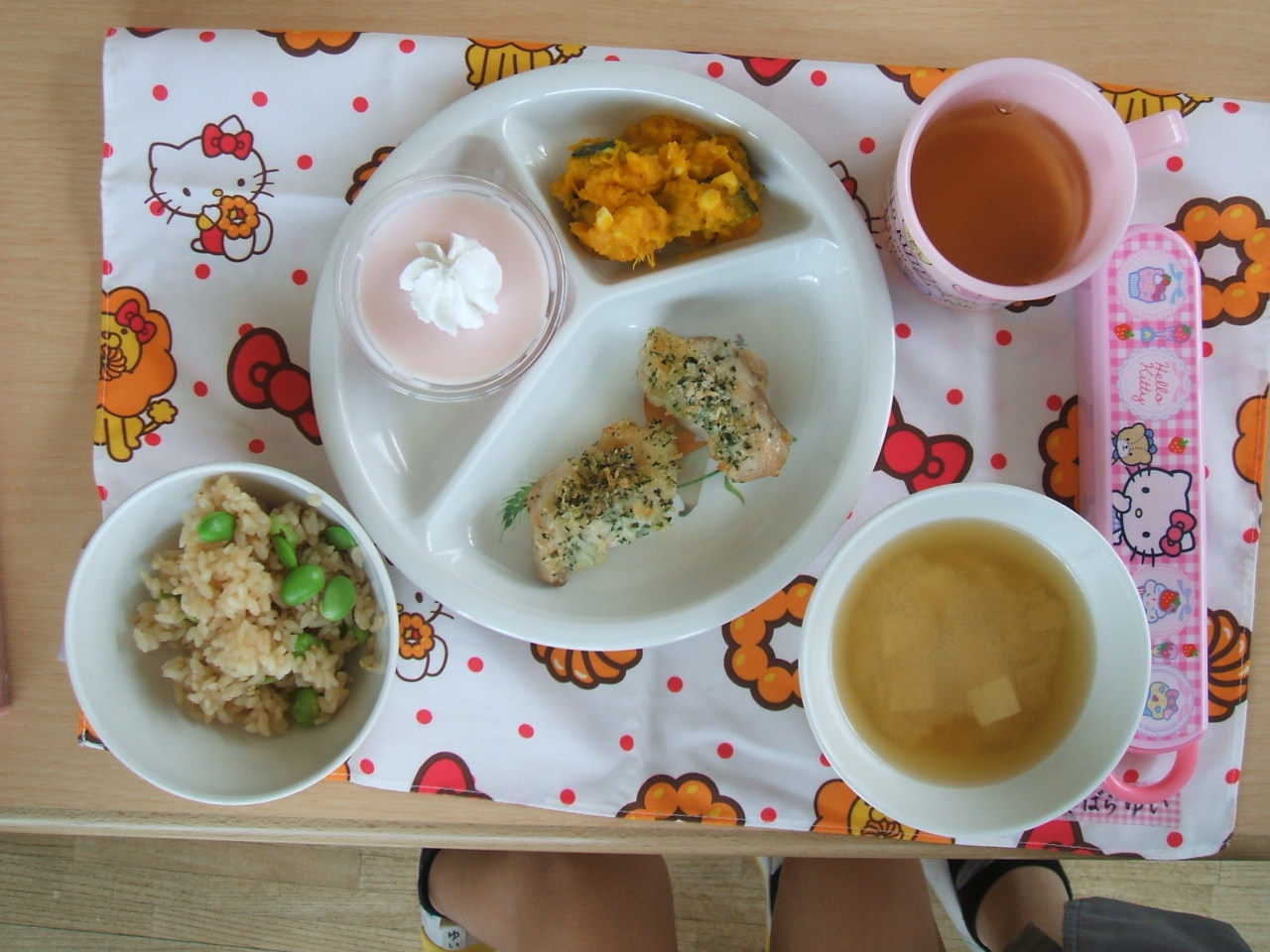 メニュ-は枝豆ご飯と鶏肉の香草焼き、お味噌汁