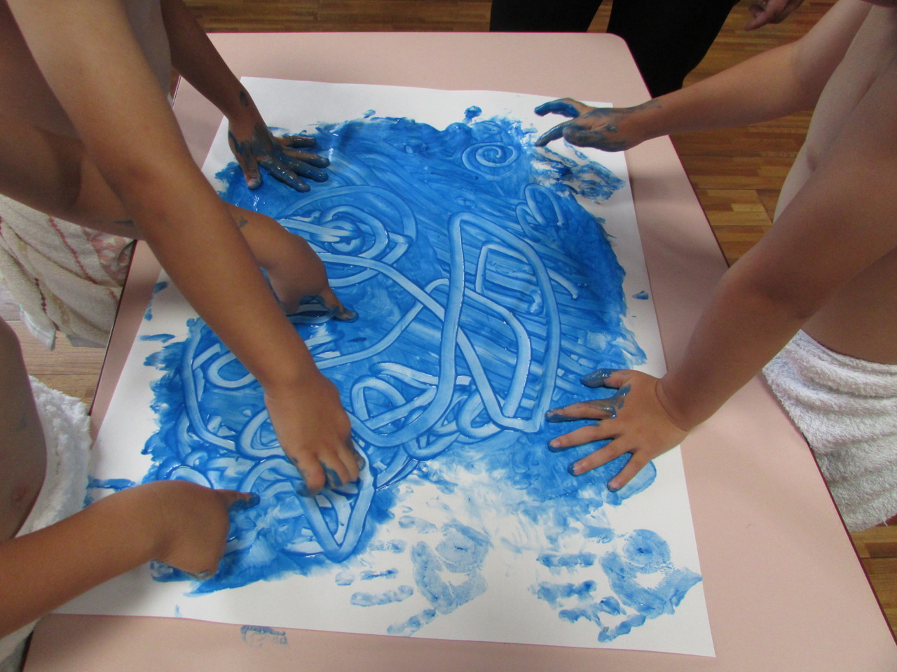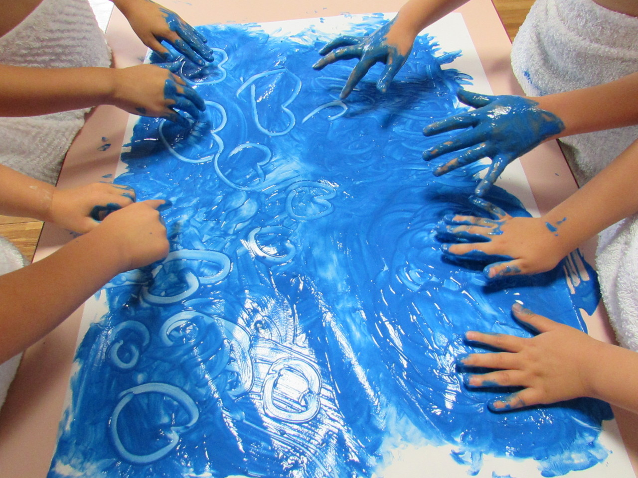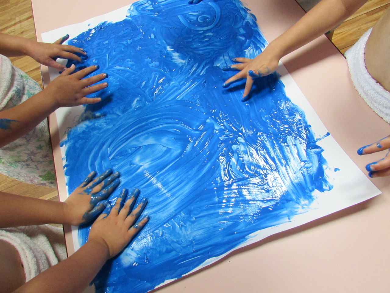 絵の具とのりを混ぜたもので、手のひらや指先などを使い絵を描き