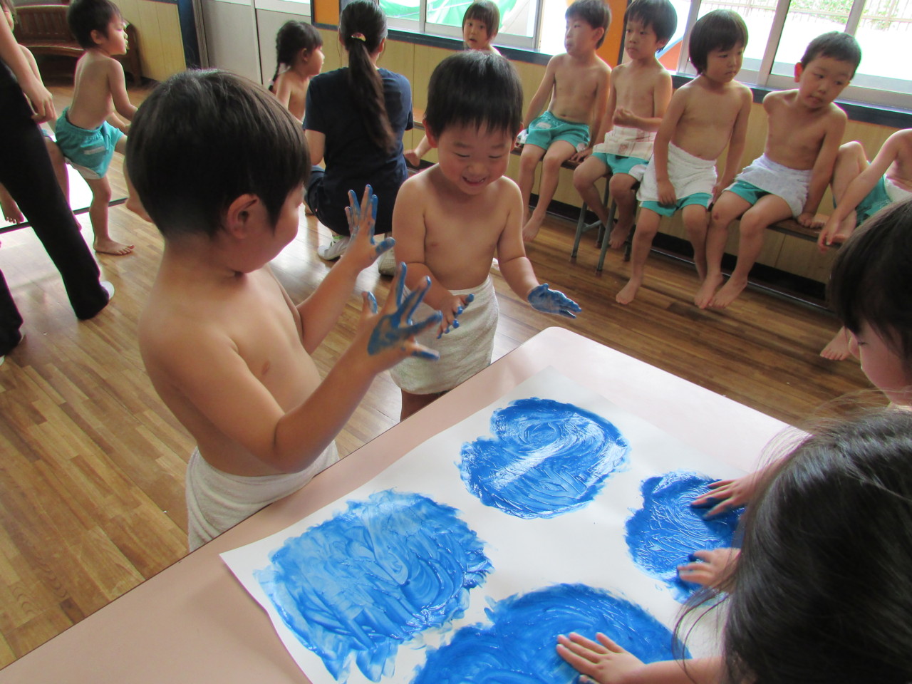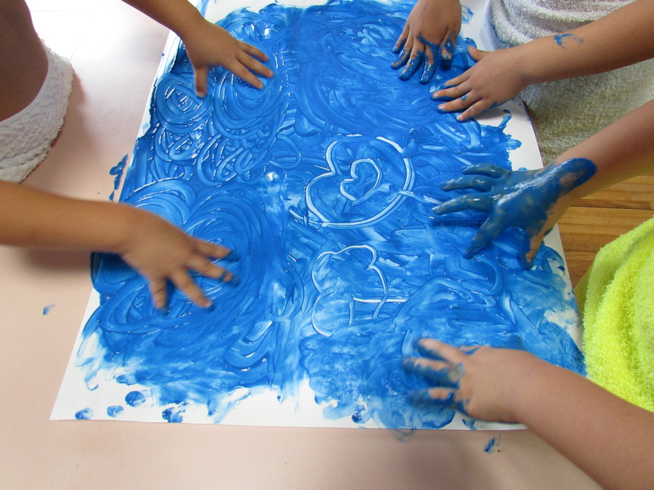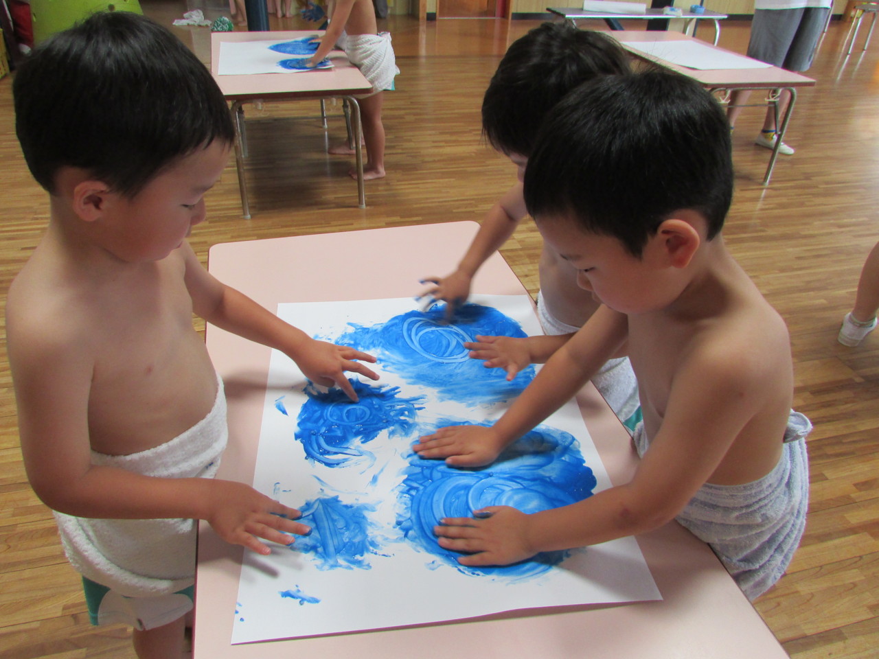 絵の具とのりを混ぜたもので、手のひらや指先などを使い絵を描き