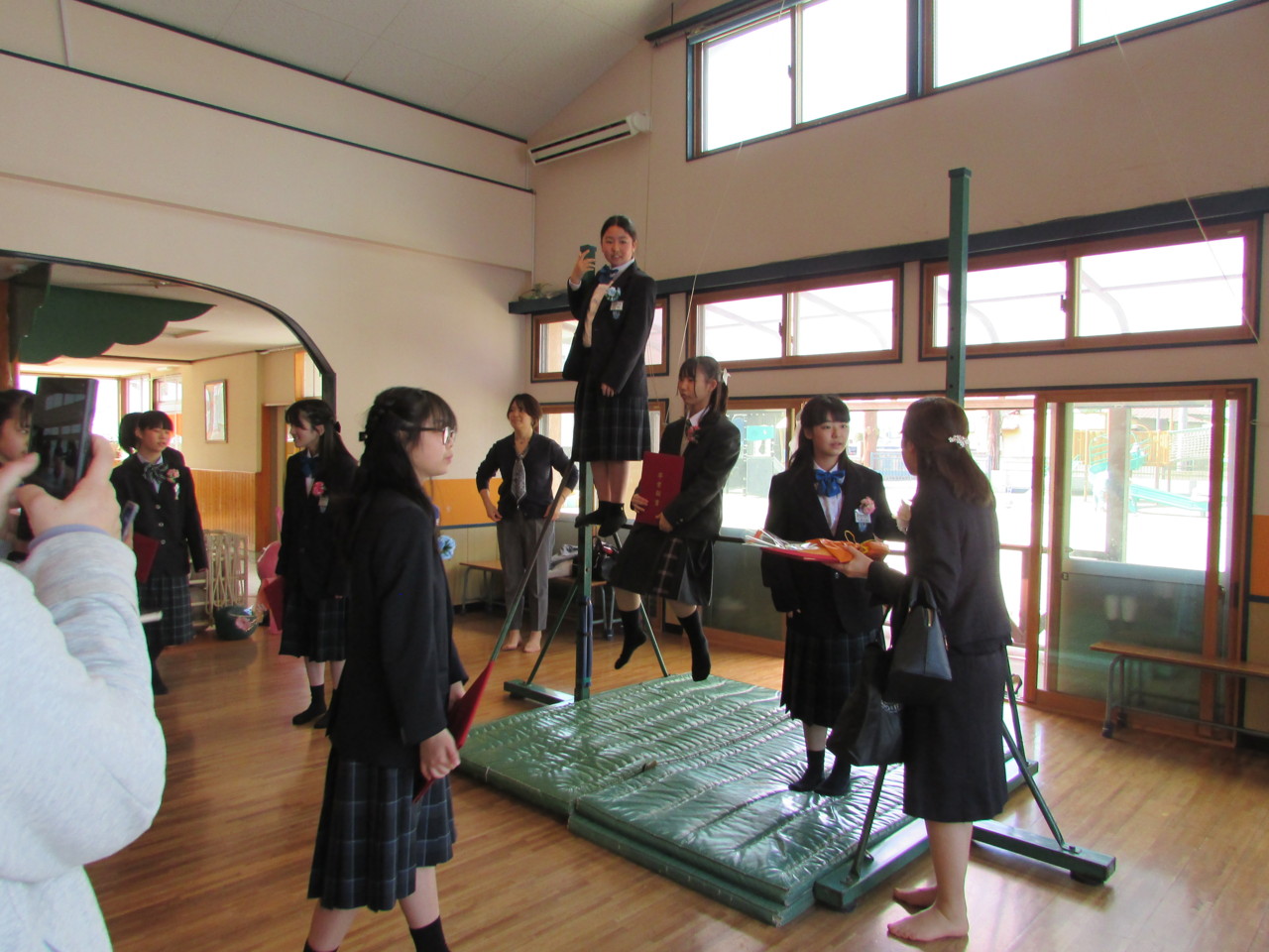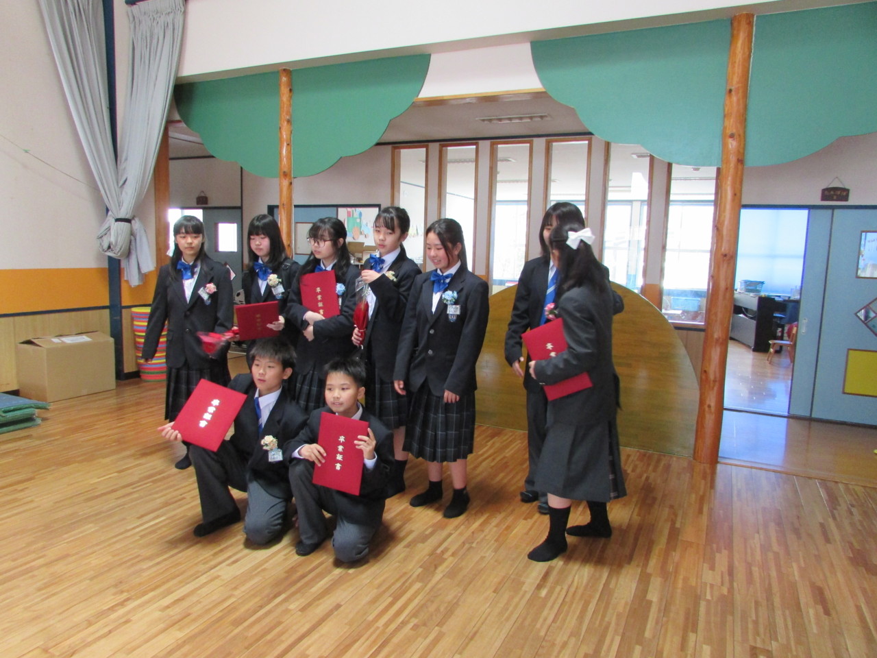 19日(木)小学校の卒業式があり、卒園生が晴れ姿を見せに来てくれました