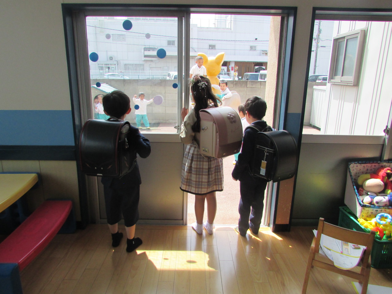 9日(木)卒園生が小学校の入学式後、ランドセル姿を見せに来てくれました