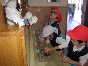 昨年末、風邪(胃腸炎)で欠席者が多かったのですが、例年この時期にも欠席者がだんだん増える時期になります。健康で過ごせるよう幼稚園では、日頃からうがい・手洗いをすすめています。お家でも外から帰ったらうがい・手洗いを・・・